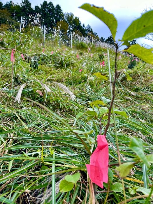 ブナやミズナラ、ヤマザクラなど15種類以上の苗を植えるため、1年間ですっかり伸びた草を刈るところからスタートしました。刈った草は肥料へ再利用するところにも環境への配慮が感じられました。