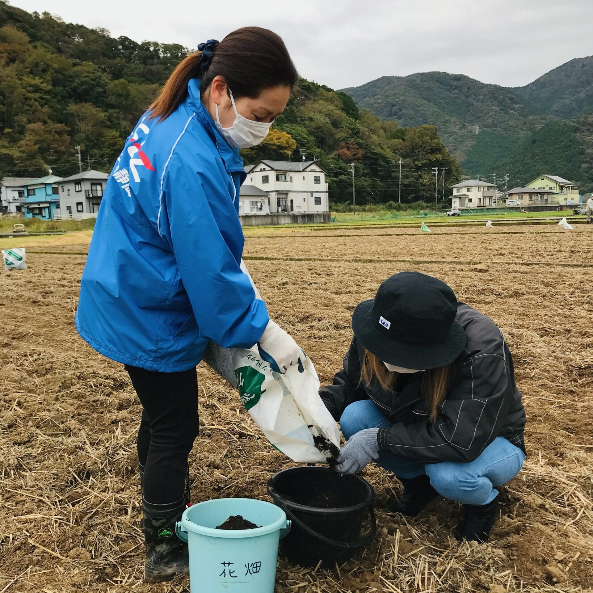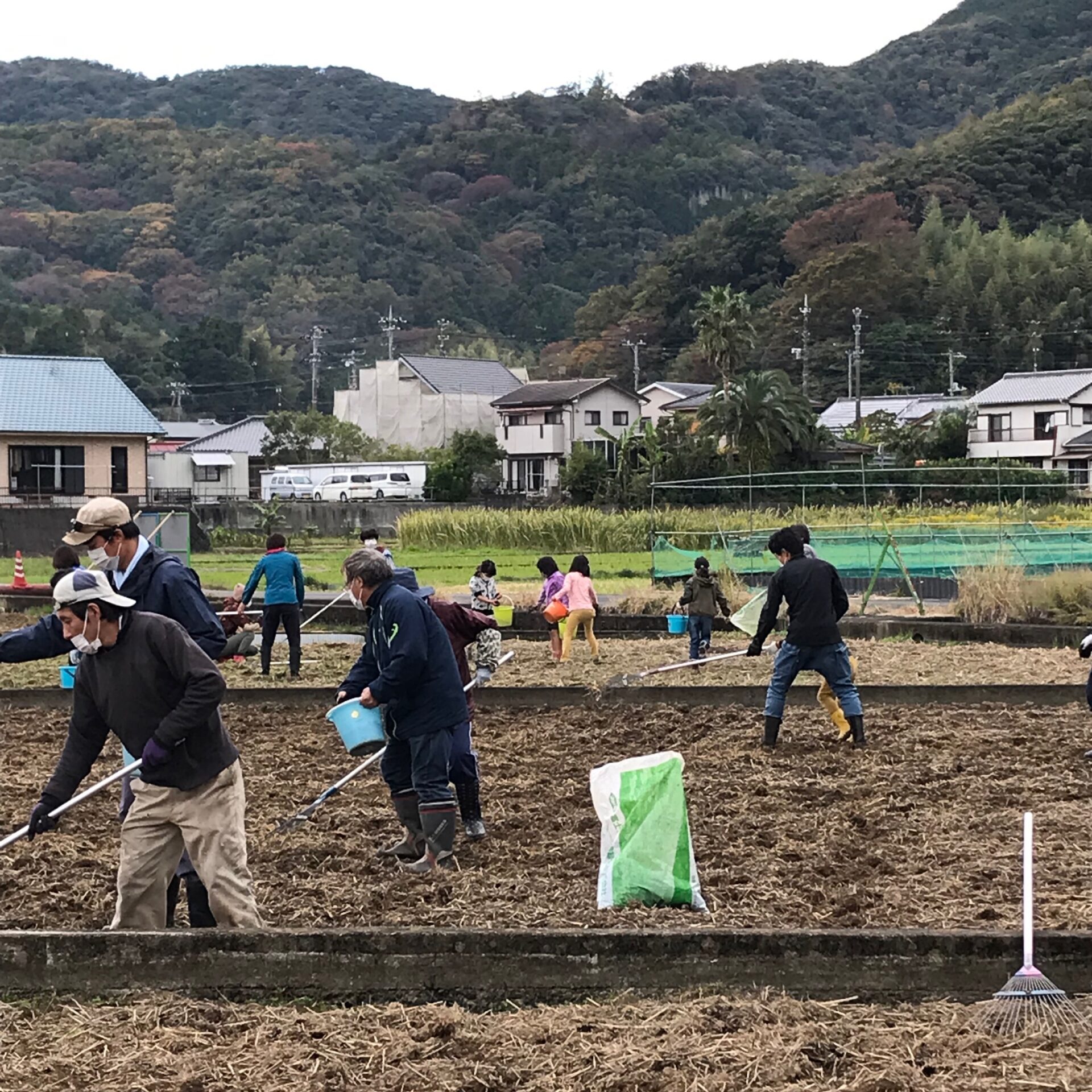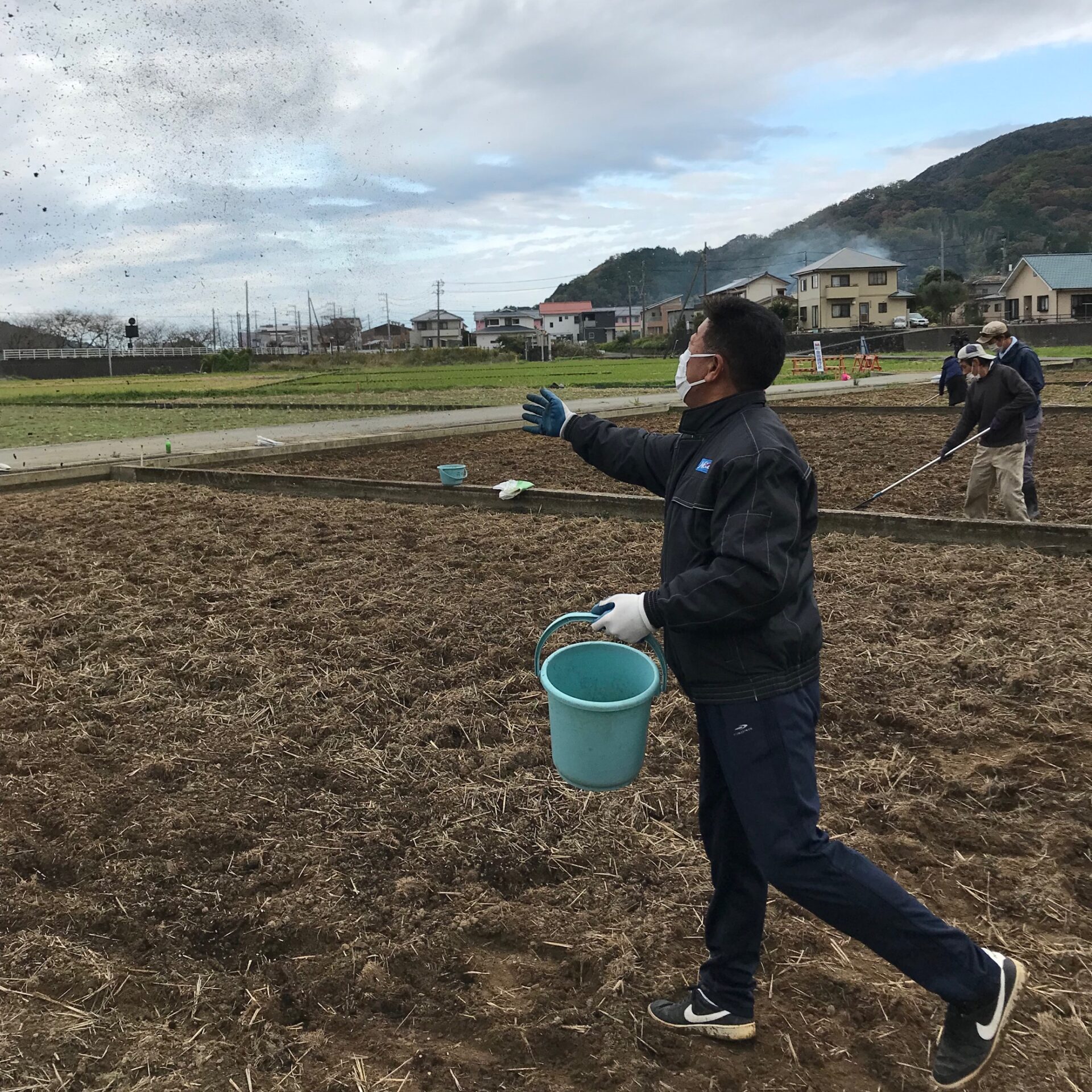 稲刈りが終わった田んぼに約40名くらいのボランティアさんが集まり、種と肥料とが混ざった土を蒔き、軽く熊手で耕します。