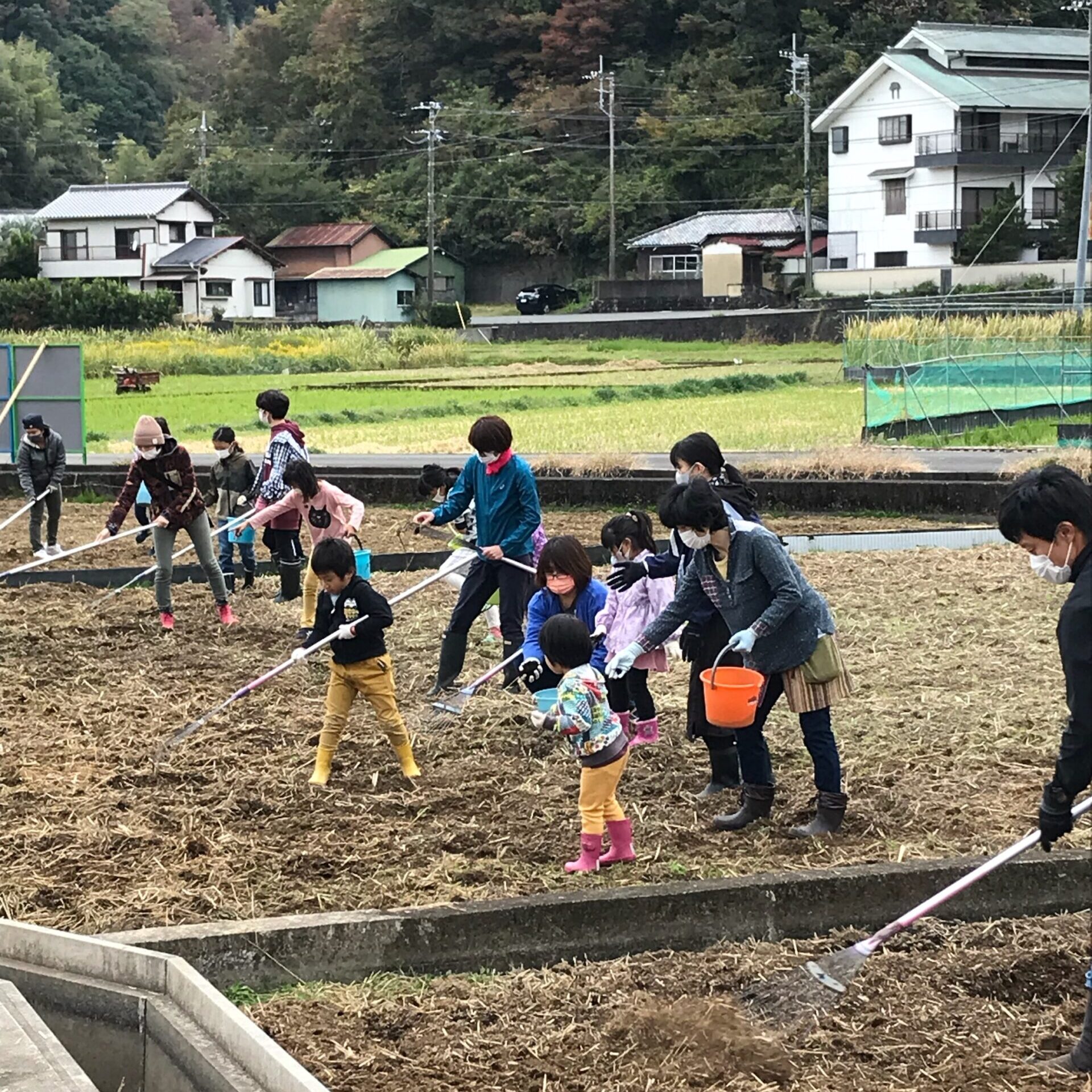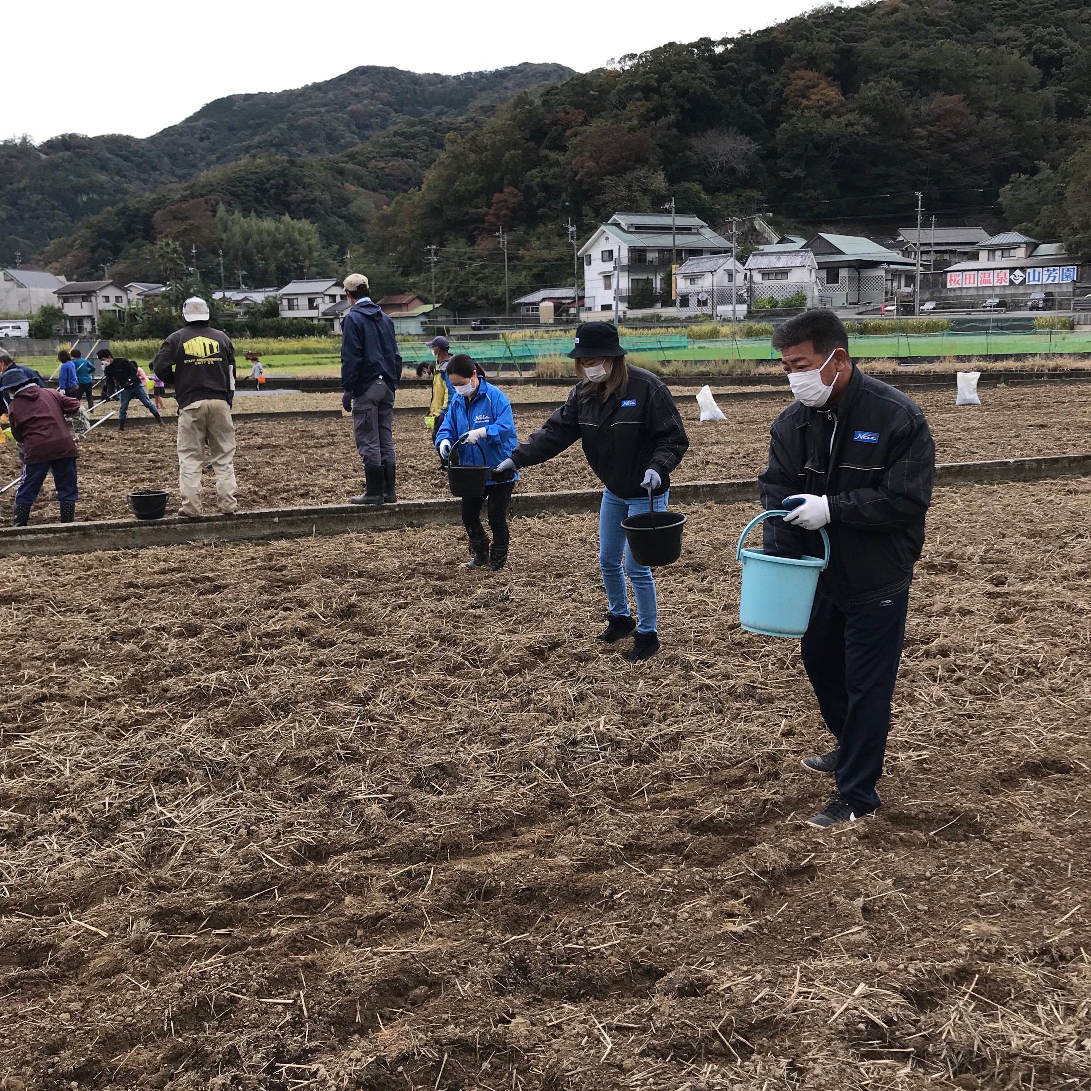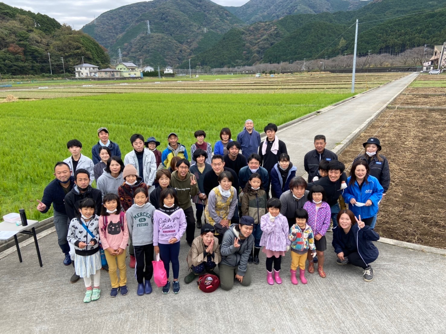 稲刈りが終わった田んぼに約40名くらいのボランティアさんが集まり、種と肥料とが混ざった土を蒔き、軽く熊手で耕します。