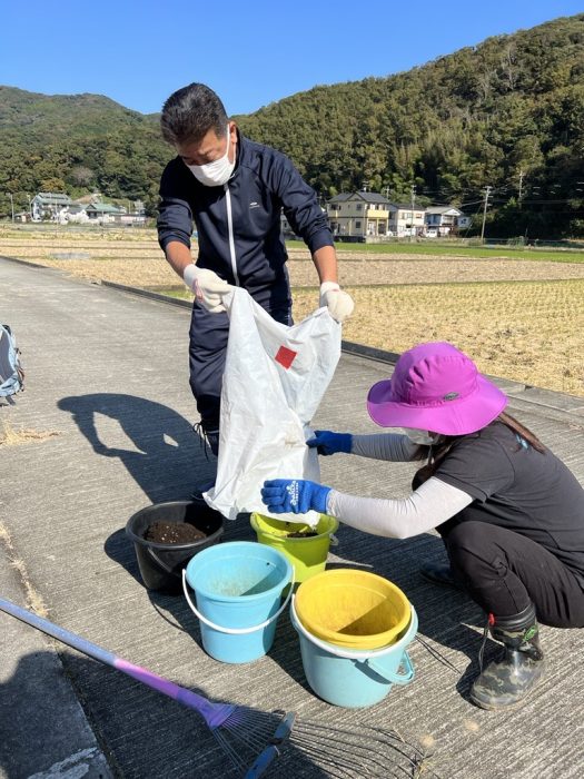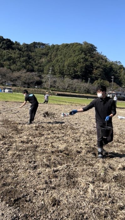 熊手を使って土をならす人、種と肥料を混ぜた土を満遍なく撒く人に分かれ