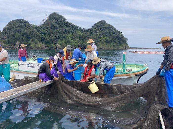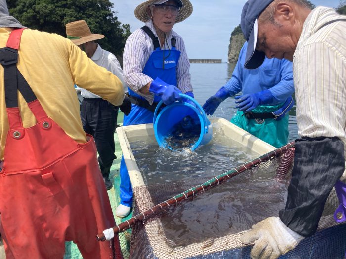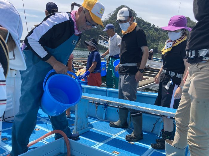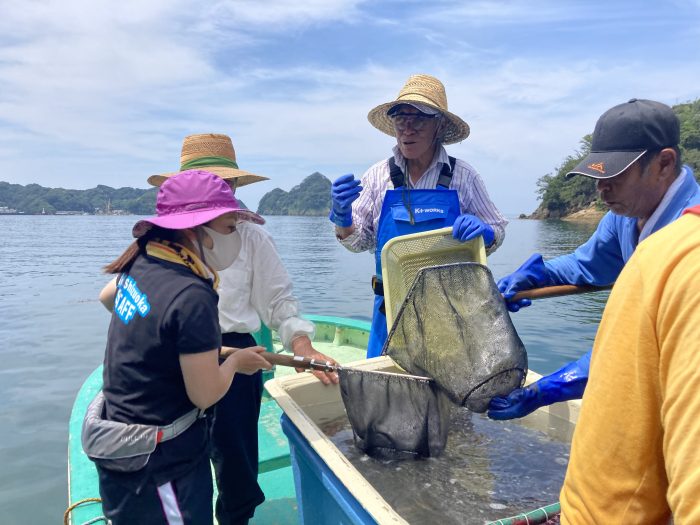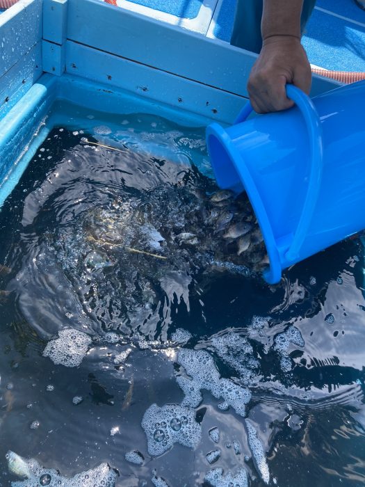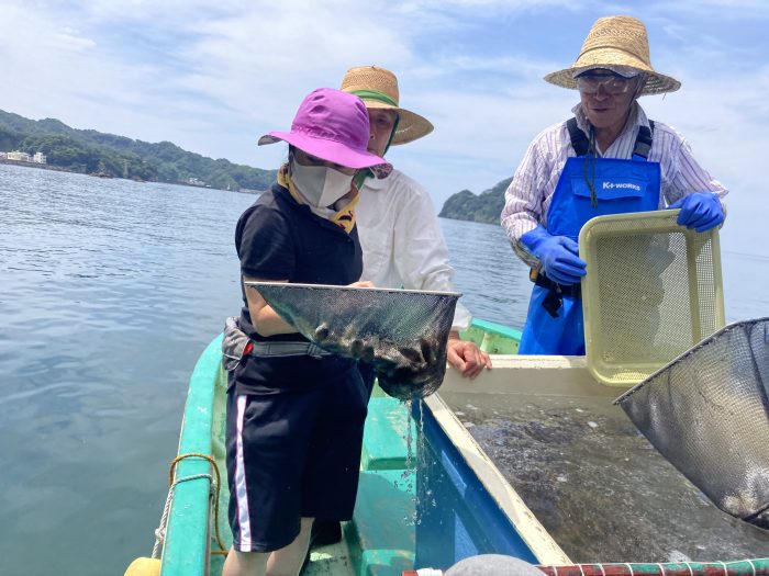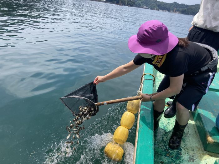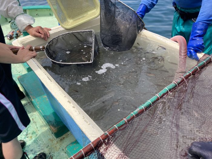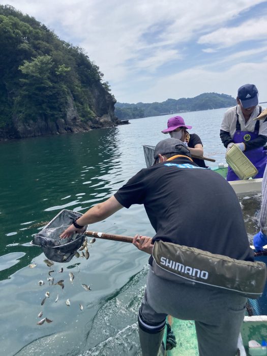 網をつかって船から海へ向かって放流。魚を網の中にいれるのが意外と難しいです。