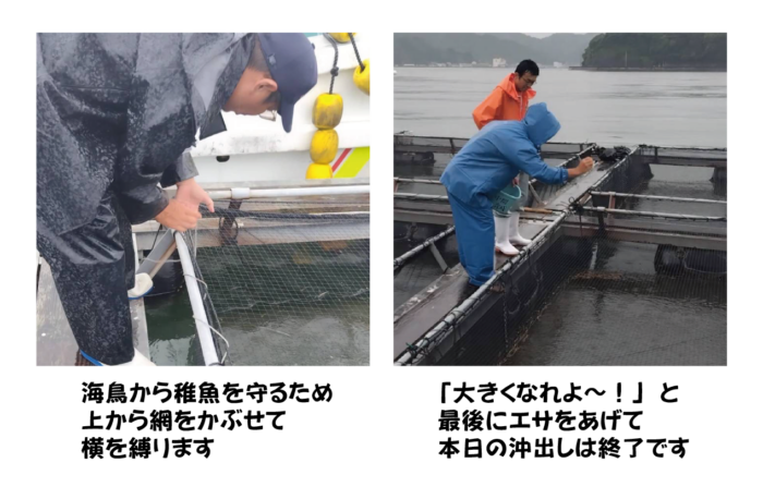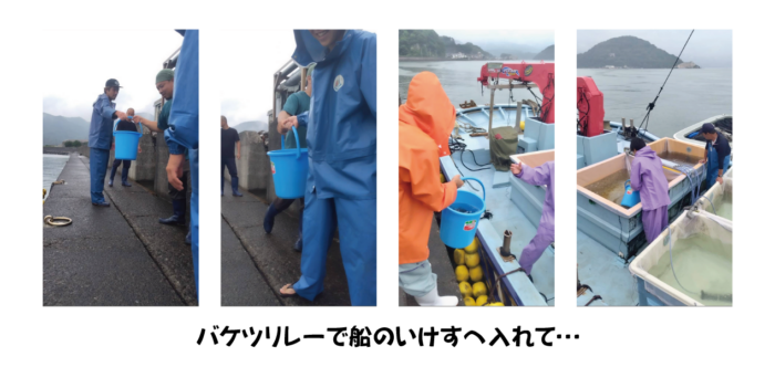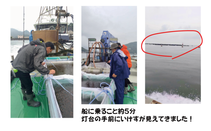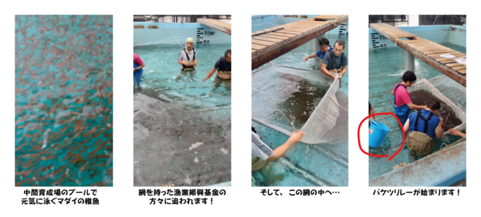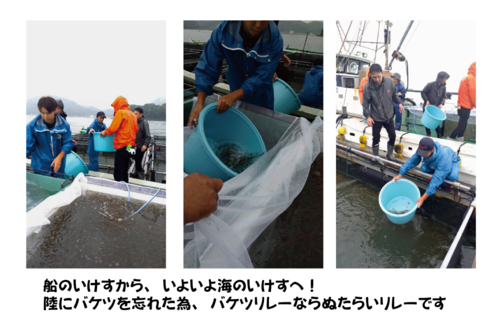 中間育成場(マダイ稚魚が2~3cmになるまで過ごすプール)から「海のいけす」に移すこと!